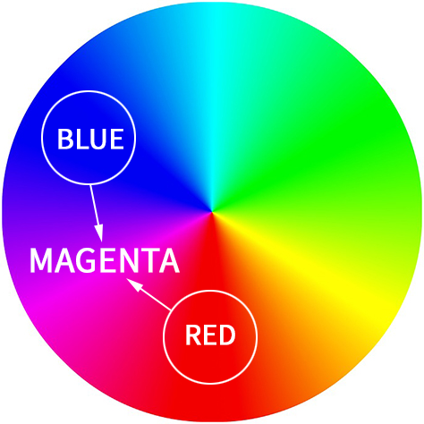 이번에는 밝은 마젠타(핑크)색을 표현하기위해서 Blue와 Red를 혼합해 보겠습니다. 아래그림을 보고 이해를 하시면 됩니다.