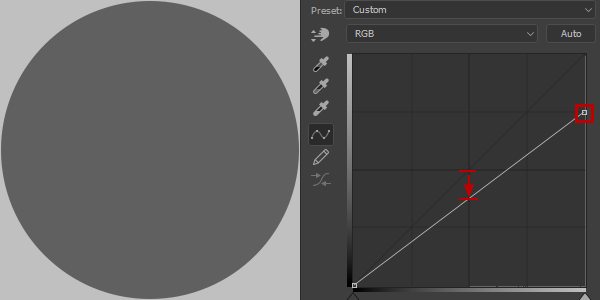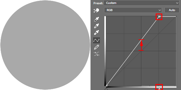 아래 그림처럼 우상단의 조절핸들을 좌측으로 1그리드만큼 이동해 보겠습니다. 50% 회색원은 좌우분포에서 정중앙에 위치합니다. 우상단의 조절핸들을 이동함으로써 정중앙부분이 화살표 위치만큼 위로 이동하였습니다. 위로 이동했다는 것은 그만큼 해당이미지의 영역이 밝아졌다는 것을 의미합니다.