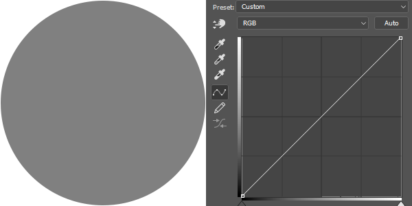 오른쪽은 Curves메뉴를 열었을 때 기본 화면입니다. 화면에서 좌우는 검정에서 흰색까지의 분포도를 나타내 줍니다. 많이 사용하는 메뉴중 하나인 Level창에서의 구조와 같다고 보시면 됩니다. 지금은 이미지가 없이 회색원 하나만 있기 때문에 히스토그램이 거의 보이질 않고 있습니다. (우측아래쪽 바닥에 희미하게나마 보이긴 합니다.)