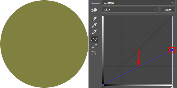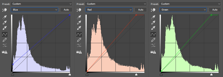 아래 그림에서 보듯이 어두운 영역에 파랑을 추가하기 위해 Blue 채널 좌하단의 조절핸들을 위로 올려주었고, 밝은 노랑을 추가해주기 위해 노랑색의 좌우에 있는 Red와 Green 채널의 우상단 조절핸들을 위로 올려주었습니다.