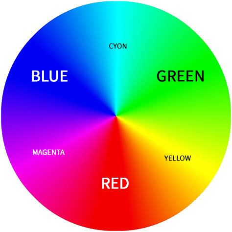 아래 색상환 그림을 보시면 더욱 이해하기 쉬울텐데요. RGB 각 채널(원색)이 존재하고 그사이 혼합색상인 Cyon, Magenta, Yellow가 존재합니다. 혼합색상은 당연히 양쪽에 존재하는 채널의 혼합으로 표현됩니다.