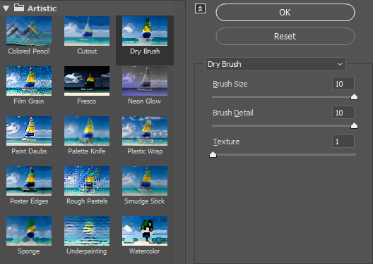 Artistic폴더에 보시면 다양한 그림효과들이 있습니다. 이중에서 유화느낌과 비슷해 보이는 Dry Brush를 선택합니다. 선택 후 오른쪽을 보시면 3가지 항목을 보실 수 있습니다.