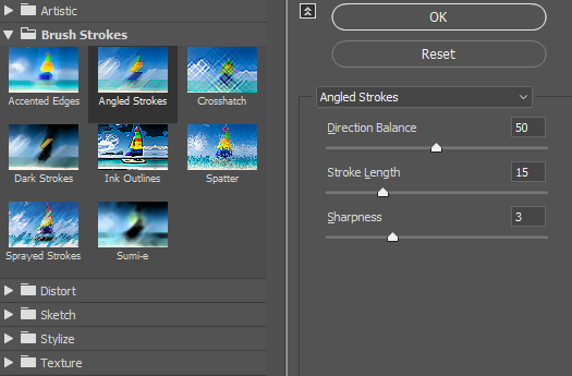 우측에는 3개의 항목이 있는데요. 첫번째 Direction Balance는 붓의 방향을 설정할 수 있는 항목입니다. 왼쪽으로 갈수록 좌상단에서 우하단 방향(-45도)으로의 터치가 강해지고 오른쪽으로 갈수록 우상단에서 좌하단 방향(45도)으로의 터치가 강해집니다. Stroke Length는 터치의 길이를 나타내고 Sharpness는 터치의 선명도를 나타냅니다.
