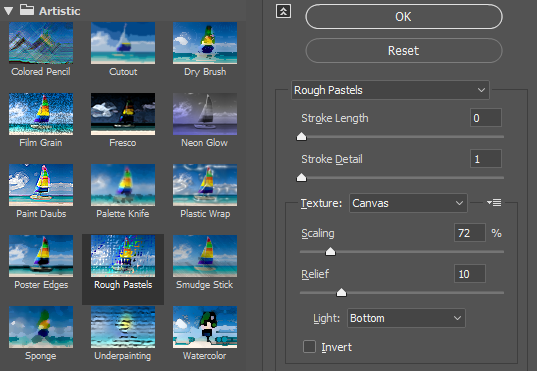 Artistic 폴더에서 Rough Pastels를 선택한 후 오른쪽 항목을 아래그림처럼 설정해 줍니다. 원래 이 효과는 파스텔느낌을 표현하기 위한 메뉴이지만 재질부분만 적용하길 원하므로 Stroke Length와 Stroke Detail는 각각 0, 1로 하여 파스텔 느낌을 없애 줍니다. 그리고 하단의 Texture를 Canvas로 선택한 후 나머지 항목을 과하지 않도록 적당하게 조절해 줍니다.