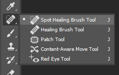 기본 노출과 화이트밸런스를 마치신 다음에는 피부 보정을 해보겠습니다. 포토샵 좌측에 보시면 힐링 툴이 있는데요. 점과 같은 도드라지는 영역을 보정하기 위해서는 아래와 같은 Spot Healing Brush Tool을 선택하시면 됩니다.