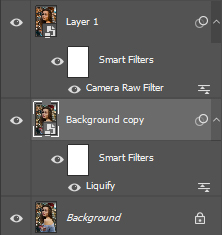 두 번째 이유는 스마트 오브젝트의 필터 효과를 언제든지 수정할 수 있다는 것입니다. 위의 화면에 있는 Background copy 스마트 오브젝트 레이어에 적용된 Liquify를 더블클릭하시면 다시 한번 Liquify 편집창으로 들어가서 지금까지 했던 Liquify작업을 수정하거나 새로운 추가 작업을 할 수 있습니다.