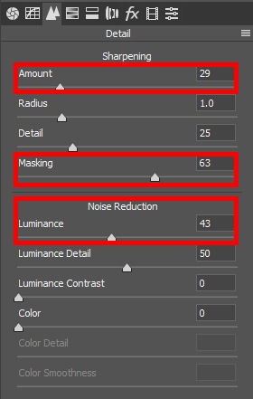 우측의 탭에서 Detail탭을 선택하시면 Sharpening과 Noise Reduction 항목을 보실 수 있습니다. 먼저 노이즈 감소(Noise Reduction) 항목의 Luminance를 원하시는 만큼 오른쪽으로 드래그해 줍니다. 저는 43 정도로 조정해 주었습니다. 너무 많이 수치를 올리시면 이미지가 뿌옇게 왜곡되어 나타나기 때문에 적당한 수준에서 타협을 해 주셔야 합니다.