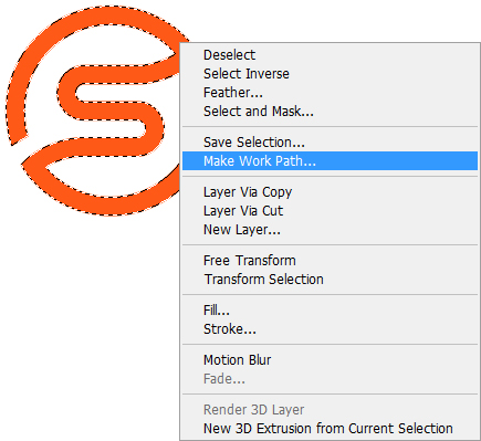 색상 범위에서 오렌지 색상을 선택하시면 아래 이미지처럼 선택되실 겁니다. 선택영역 내에서 마우스 오른쪽 버튼을 클릭하시면 관련 메뉴가 나타나는데 이 중에서 패스 만들기를 선택해 줍니다.