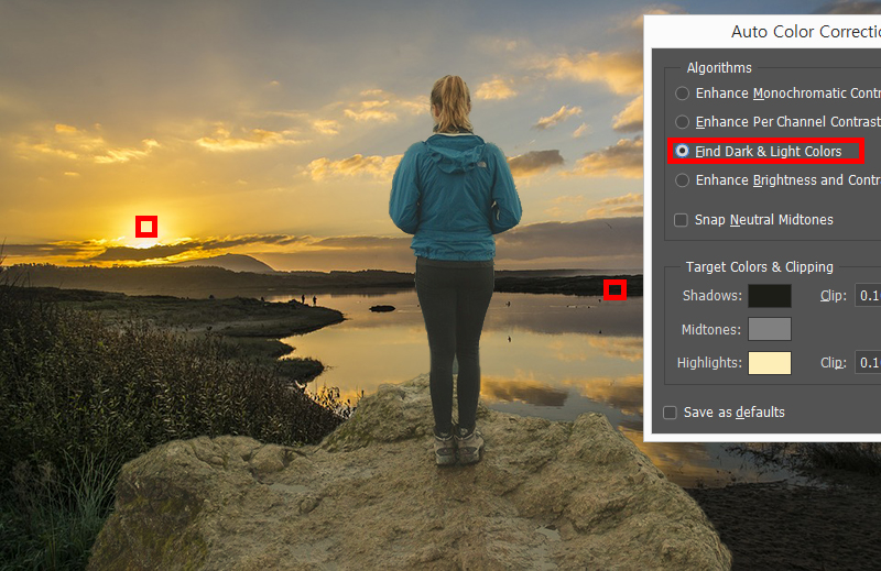 자동 색상 보정 창에서 3번째 있는 Find Dark & Light Colors을 선택합니다. 그러면 하단에 Target Colors & Clipping이라는 항목에 Shadows, Midtones, Highlights 세 가지 색상 정보가 나타납니다. 제목인 'Find Dark & Light Colors'에서 알 수 있듯이 Shadows와 Highlights를 통해서 레이어의 색상을 보정해 줄 수 있습니다.