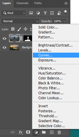 레이어 창 하단의 'Create a new fill or adjustment layer' 아이콘을 클릭한 후 Curves메뉴를 선택합니다.
