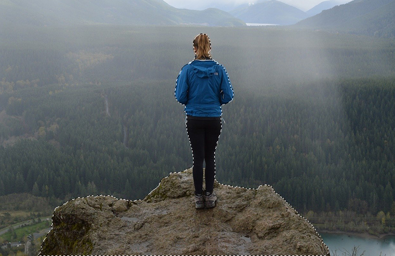 아래이미지와 같이 사람과 바위가 자동으로 선택됩니다. 사각 영역을 드래그하는 경우에 따라서 간혹 다르게 자동 선택되는 경우도 있는데요. 이때는 Shift 키를 누른 채 마우스를 드래그해서 개체 선택을 추가하거나 Option키를 누른 채 마우스를 드래그해서 선택을 제외할 수도 있습니다.