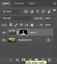 선택이 되었으면 인물사진 레이어가 선택되어 있는 상태에서 레이어 창 하단의 Add vector mask 아이콘을 클릭합니다. 이렇게 하면 인물사진 레이어에 선택된 영역 정보를 가지는 레이어 마스크가 자동 생성됩니다. 또한 선택영역 이외의 영역이 투명해지면서 배경 이미지가 보이게 됩니다.