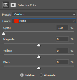 이번에는 Selective Color 레이어를 생성한 후 Reds색상을 선택한후 Cyans를 -100으로 이동해 줍니다. 하늘색을 빼 줌으로써 빨간색이 더욱 강조되었습니다.
