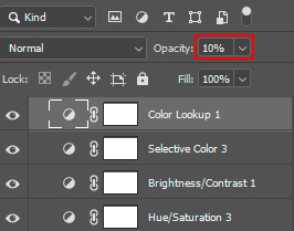 레이어에서 컬러룩업의 불투명도를 10% 정도로 낮추어 줍니다.