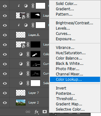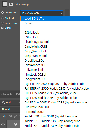 레이어 창 하단의 Create new fill or adjustment layer아이콘을 클릭한 후 Color Lookup메뉴를 선택합니다. 3D LUT 라디오 버튼을 선택한 후(기본 설정) 오른쪽 풀다운 메뉴에서 EdgyAmber.3DL을 선택합니다.