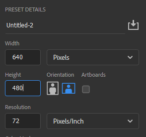 문서 설정 창에서 가로 640픽셀 세로 480픽셀을 입력해 줍니다. 해상도는 72로 설정합니다.