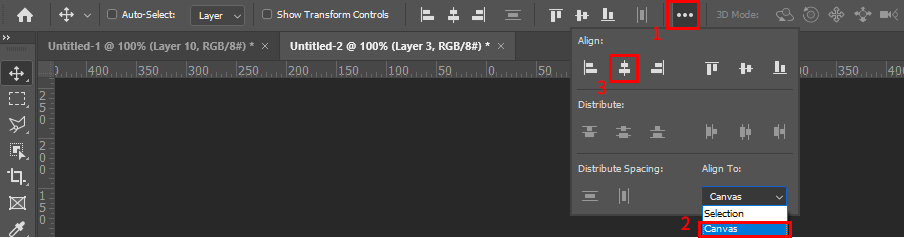 메뉴바 바로 아래에 있는 (선택도구)속성바에서 '...' 아이콘을 선택합니다. 이 아이콘은 레이어 정렬을 할 수 있는 옵션입니다. Selection, Canvas 두 개 메뉴 중에 Canvas 메뉴를 선택합니다.