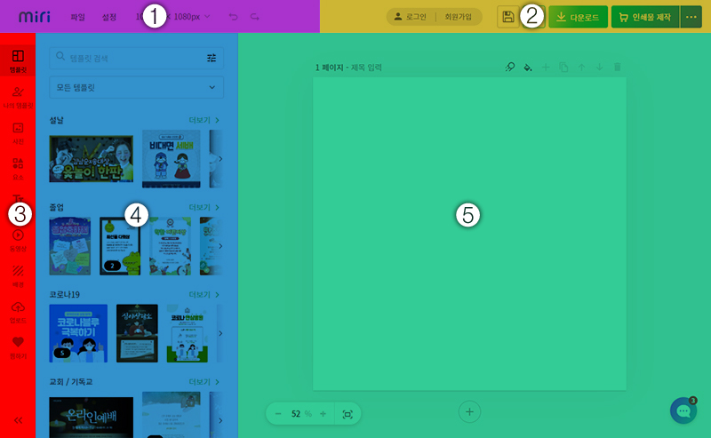 1번은 메뉴 영역, 2번은 로그인 영역, 3번은 제작 툴 영역, 4번은 속성 창, 5번은 작업창으로 이해해 주시면 됩니다.