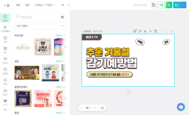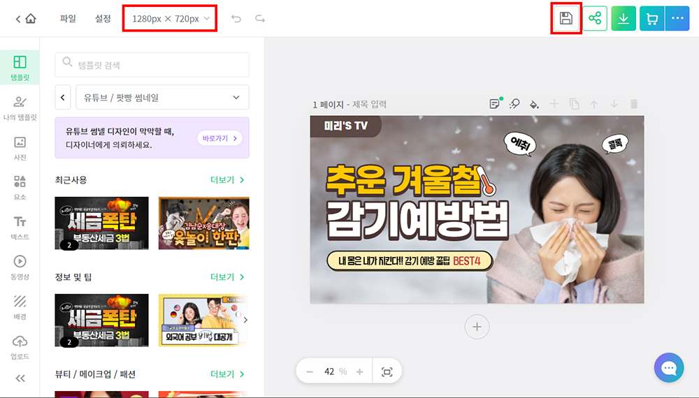내 문서 화면의 상단에 1280X720이라는 숫자가 보이는데 이것은 유튜브 썸네일의 가로, 세로 사이즈가 얼마인지 알려주고 있습니다. 오른쪽에는 저장 버튼이 있는데 중간중간 저장 버튼을 눌러서 만약의 사태를 대비해 주시면 됩니다.