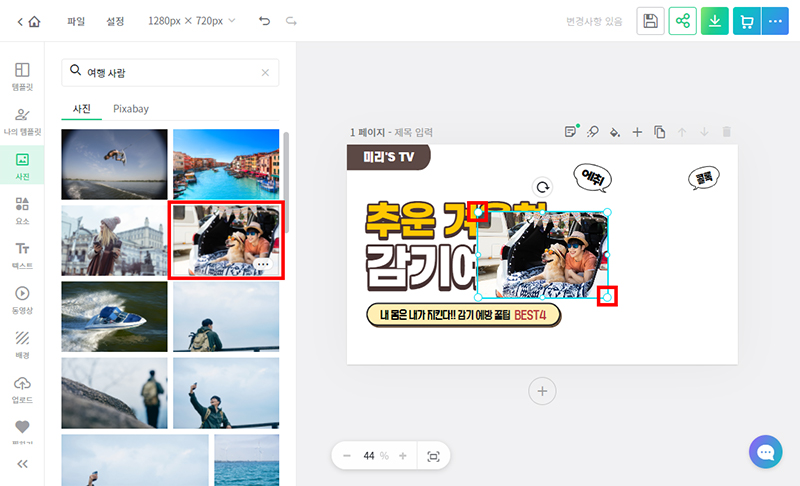 사진을 넣을것이기 때문에 좌측 툴박스에서 '사진'아이콘을 클릭합니다. 설정창이 사진 검색창과 사진 리스트로 바뀌었습니다. 여행을 주제로 하는 유튜브 영상을 만들었다고 가정하고 검색어로 여행 사람을 입력해 보았습니다. (검색창에는 여러 검색어를 동시에 입력하여 검색어를 동시에 만족하는 사진만 검색할 수 있습니다.)