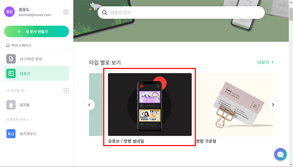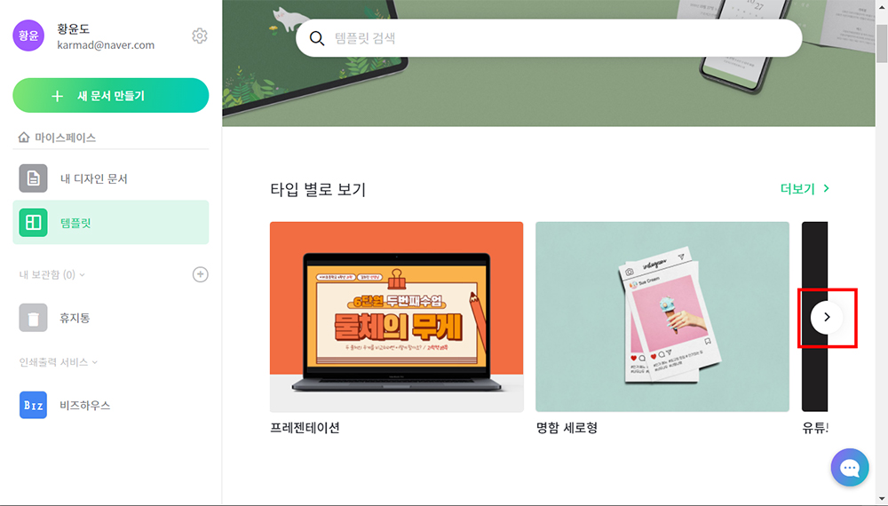 두 번째 방법은 좌측의 2번 '내 디자인 문서'를 클릭하는 것입니다. 그러면 아래 그림과 같이 이미지로 된 썸네일을 볼 수 있습니다. 타입별로 보기 섬네일 리스트 오른쪽에 있는 화살표를 클릭하면 다음 썸네일 리스트를 볼 수 있습니다.