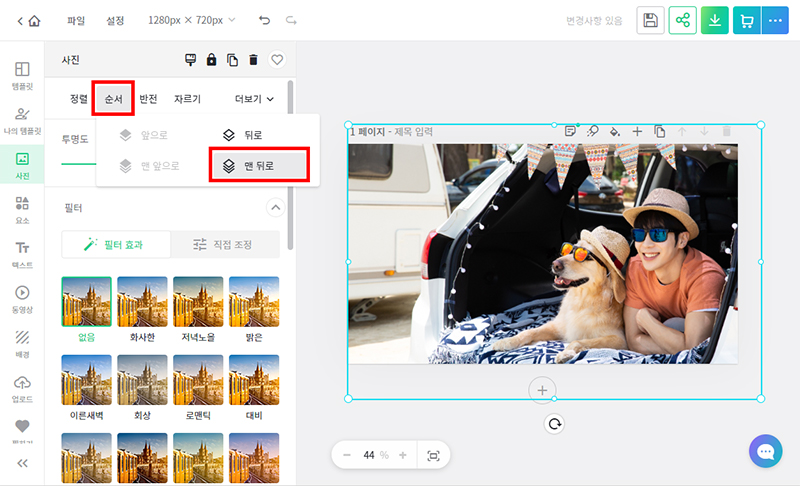 아래 그림을 보면 사진의 크기는 커졌지만 기존에 있던 글자와 도형 등이 가려져서 보이지 않게 되었습니다. 사진을 맨 뒤로 이동해서 기존의 글자 등이 보이게 해 주려면 사진을 선택한 상태에서 설정 창의 위쪽에 있는 '순서'를 클릭한 후 '맨 뒤로'아이콘을 클릭하면 됩니다.