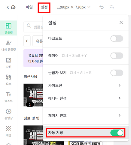 상단의 메뉴에서 설정을 클릭하면 제일 아래쪽에 자동저장 항목이 있는데 기본적으로 활성화되어 있습니다. 굳이 위에서 말한 저장버튼을 누르지 않아도 일정 시간 간격으로 자동 저장되기 때문에 초보자에겐 참 유용한 기능입니다.