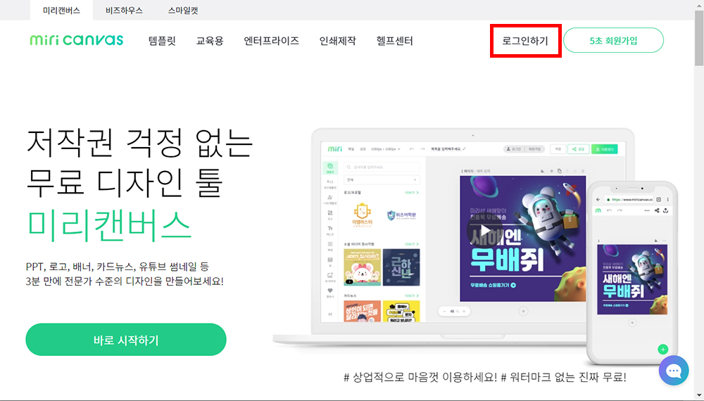 미리캔버스 홈페이지를 접속하신 후 상단의 로그인하기 버튼을 눌러서 로그인해 줍니다. (회원가입이 안되어 있다면 바로 오른쪽에 있는 5초 회원가입을 통해 가입해 주시면 됩니다.)