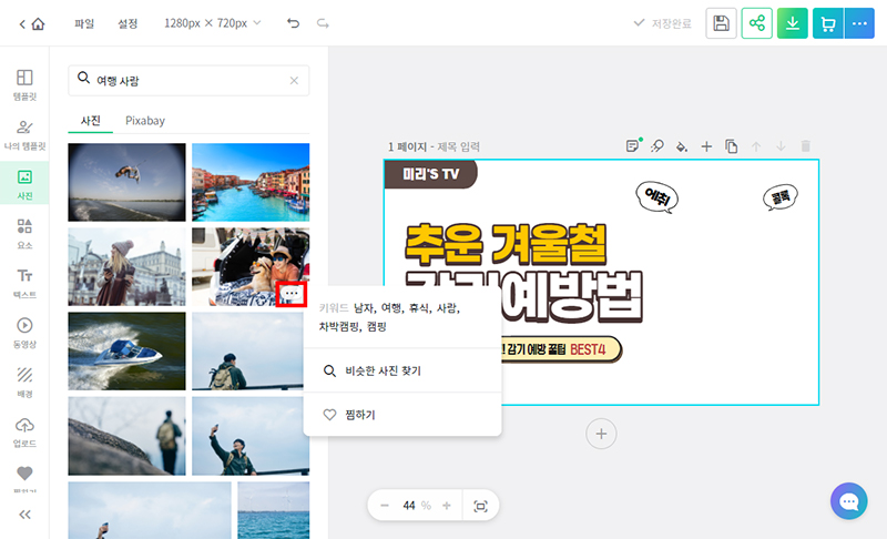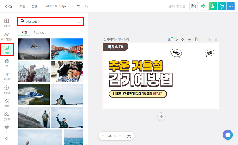 * 검색창 아래에는 사진, Pixabay 두가지 탭이 있습니다. 기본 설정으로 사진 탭에서만 검색이 이뤄지므로 맘에 드는 사진이 없는 경우에는 반드시 Pixabay 탭을 선택하고 재검색해 보시길 바랍니다.