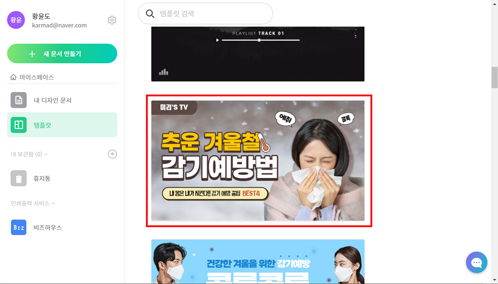 로그인하기를 거치면 아래와 같은 화면이 나옵니다. 기본 메뉴로 왼쪽에 '내 디자인 문서'메뉴가 활성화되어있고 오른쪽에 내가 저장했던 디자인 문서 리스트를 볼 수 있습니다.