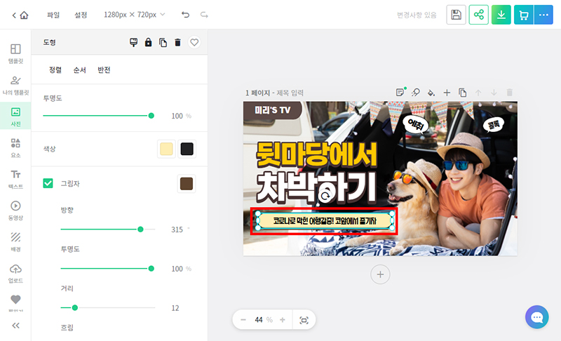 문서 화면에서 메인 카피에 해당하는 글자를 선택하면 왼쪽에 설정창이 글자의 속성을 확인하고 수정할 수 있는 창으로 변경됩니다. 문구를 '뒷마당에서 차박하기'로 변경해 줍니다.