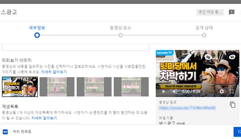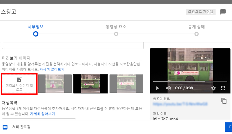 동영상이 등록된 후 아래쪽에 보면 '미리 보기 이미지 업로드' 항목이 보입니다. 클릭해서 앞서 디자인해서 저장한 파일을 등록해 줍니다.