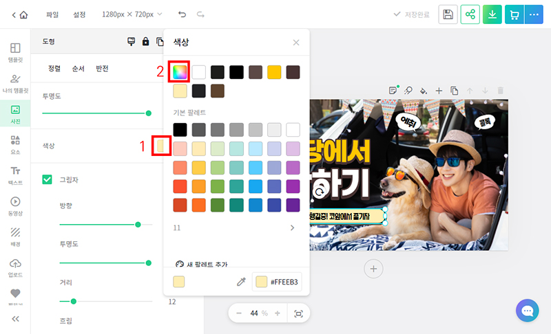 도형의 색상을 바꾸기 위해서는 설정창의 색상 항목 오른쪽의 색상 팔레트를 클릭한 후 팝업에서 색상환을 클릭합니다.