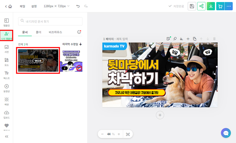 마지막으로 지금까지 한 작업을 위쪽의 디스켓 아이콘을 클릭해서 저장해 줍니다. 왼쪽 툴바에서 나의 템플릿 아이콘을 클릭하면 방금 저장한 문서를 확인할 수 있습니다.