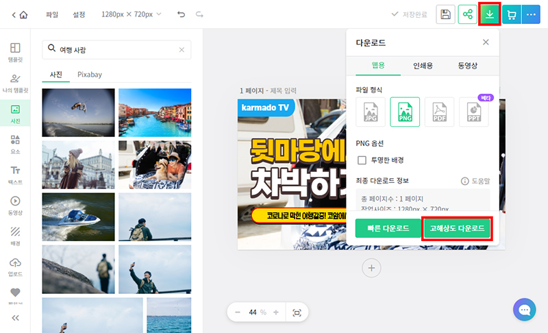 지금까지 작업한 내용이 맘에 드신다면 유튜브에 적용하기 위해 파일로 저장을 해야 합니다. 문서 화면 위쪽의 다운로드 버튼을 클릭합니다. 유튜브는 웹 기반이기 때문에 웹용 탭을 선택하신 후 원하는 파일 형식을 선택해 줍니다.