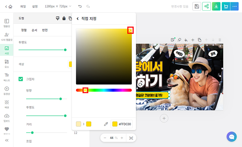 (아래쪽의 스포이드를 클릭하고 문서 화면상에서 원하는 색상을 클릭하면 같은 색상으로 바뀝니다.)