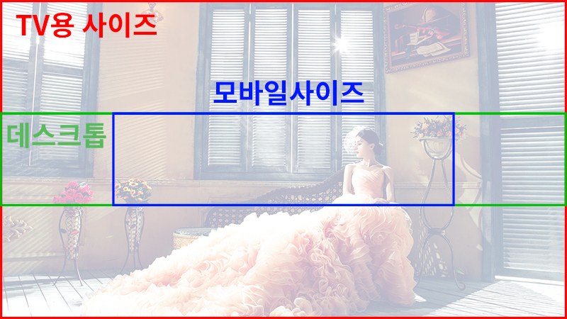 먼저 유튜브 배너아트(채너아트)는 전체 사이즈가 2560픽셀 X 1440픽셀 사이즈입니다. 아래 이미지에서 보시는 TV용 사이즈입니다. 가장 작은 사이즈는 모바일 사이즈인 1546픽셀 X 423픽셀 사이즈입니다. 아래에서 보듯이 디바이스별로 다양한 사이즈로 컷팅되어 보이기 때문에 배너아트(채널아트)에 포함되는 필수 내용들은 무조건 모바일사이즈 안에 들어가도록 디자인해야 합니다.