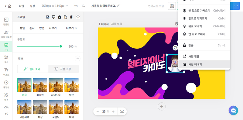 사진 프레임으로 마우스 커서를 가져간 후 마우스 오른쪽 버튼을 클릭하면 아래 이미지와 같은 관련 메뉴가 나오고 제일 아래에 있는 사진 빼내기 메뉴를 선택합니다.