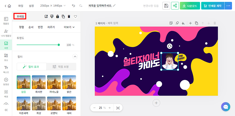 이제 유튜브 채널에 들어갈 프로필 사진을 변경해 보겠습니다. 문서 화면에서 사진 이미지를 선택하면 좌측의 설정창에 '프레임'이라고 표시되는 것을 확인할 수 있습니다. 사진을 선택했기 때문에 사진이라고 나와야 하는데 프레임으로 표시된다는 것은 사진이 프레임에 갇혀 있다는 얘기입니다. 현재 템플릿에 있는 사진은 원형의 프레임에 마스크 처리되어 있는 것입니다.