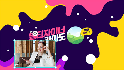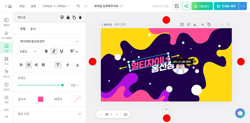 먼저 내 유튜브 채널 이름으로 수정해 보겠습니다. 수정을 원하는 글자를 마우스로 더블클릭하시면 글자가 선택이 되며 이 상태에서 키보드를 이용해서 원하는 문구를 입력하시면 됩니다. 저는 '멀티자이너'문구를 입력했더니 기존 글자 수인 3글자를 초과해서 두줄로 나타났습니다. 이럴 경우에는 디자인 영역 주변의 회색 바탕(아래 그림에서 빨간색원 영역)을 클릭하시면 텍스트 편집 모드를 벗어나게 됩니다. 다시 텍스트를 선택한 후(더블클릭이 아닙니다) 좌우상하의 조절점 중에서 좌측 조절점을 좌측으로 드래그하고 우측 조절점을 우측으로 드래그하여 텍스트 영역을 넓혀주면 '멀티자이너'5글자가 한 줄에 나타납니다.