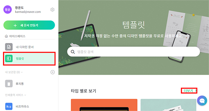 미리캔버스 홈페이지(www.miricanvas.com/)에 접속한 후 상단의 '로그인 하기'를 이용하면 아래 화면으로 접속하게 됩니다. 초기 화면에서 좌측 메뉴에 있는 템플릿을 클릭하면 오른쪽에 템플릿 검색과 다양한 유형의 리스트가 나옵니다. 초기 리스트에는 원하는 유튜브 배너아트가 없기 때문에 오른쪽의 더보기 메뉴를 클릭합니다.