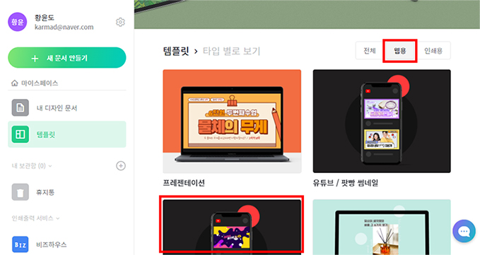 아래의 타입별로 보기에서 웹용 탭을 클릭해서 웹용 템플릿만 리스트에 나오도록 한 후 아래 섬네일 리스트에서 유튜브/팟빵 채널아트를 선택합니다.