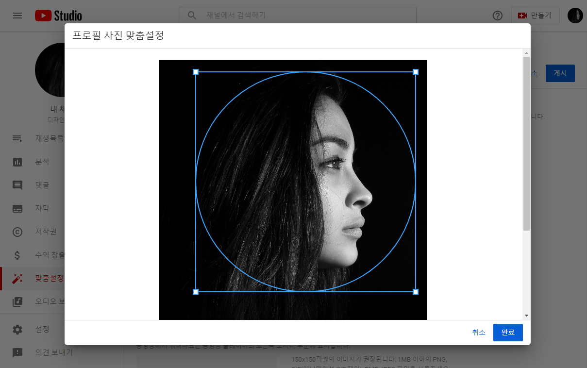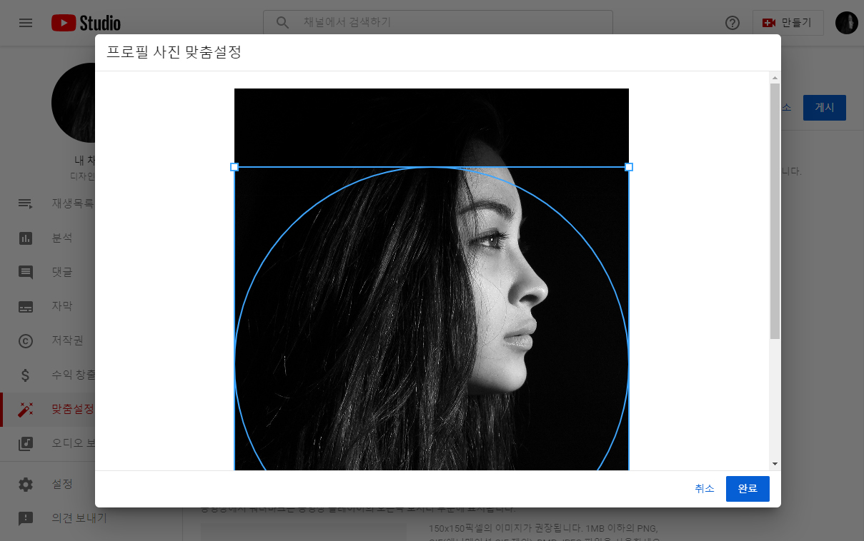 정원의 위치와 사이즈를 조정해 주었다면 '완료'버튼을 클릭해 줍니다. 아래 이미지처럼 정원에 마스크되어 보입니다. 다음으로 우상단의 '게시'버튼을 눌러 주십시오. 이 버튼을 눌러주어야만 실제 내 채널의 프로필 사진으로 등록됩니다.