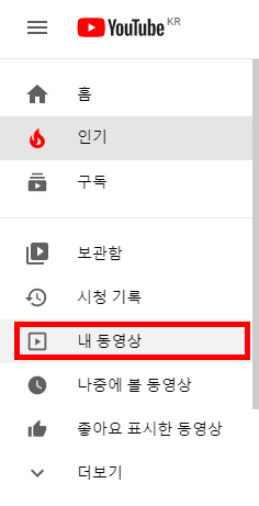 먼저 유튜브에 접속하신 후 좌측의 메뉴에서 '내 동영상'메뉴를 선택합니다.