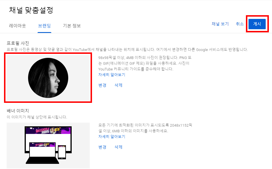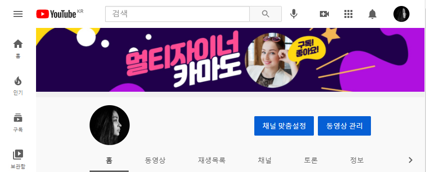 이제 적용된 화면을 보시면 앞선 강좌 ' 유튜브 배너아트 디자인'으로 제작한 배너가 내 채널 상단에 보이고 그 아래쪽과 우상단의 로그인 프로필에 좀 전에 등록한 프로필 사진이 반영된 것을 볼 수 있습니다.
