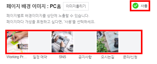 '고급 편집'탭에서 맨 아래로 스크롤하면 페이지 배경 이미지 항목을 볼 수 있습니다. 이 항목의 오른쪽에 있는 사용을 체크해 주십시오. 아래쪽에는 모든 서브페이지 리스트가 빈 박스로 나타납니다. 배경 이미지 등록을 원하는 페이지를 클릭한 후 원하는 이미지를 등록해 주면 됩니다.