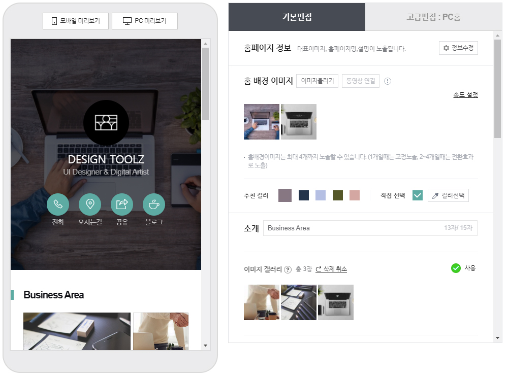 지금까지 PC화면을 별도로 편집해 보았습니다. 아쉽게도 서브페이지마다 별도로 PC편집을 할 수 있는 방법은 없습니다. 하지만 이 정도만 해도 충분해 보이며 너무 많은 기능들은 넣기보다는 기본에 충실한 홈페이지라고 생각됩니다. 쇼핑몰, 블로그, SNS 모든 것을 연동해주는 공짜 홈페이지. 이것이면 충분하지 않을까요?