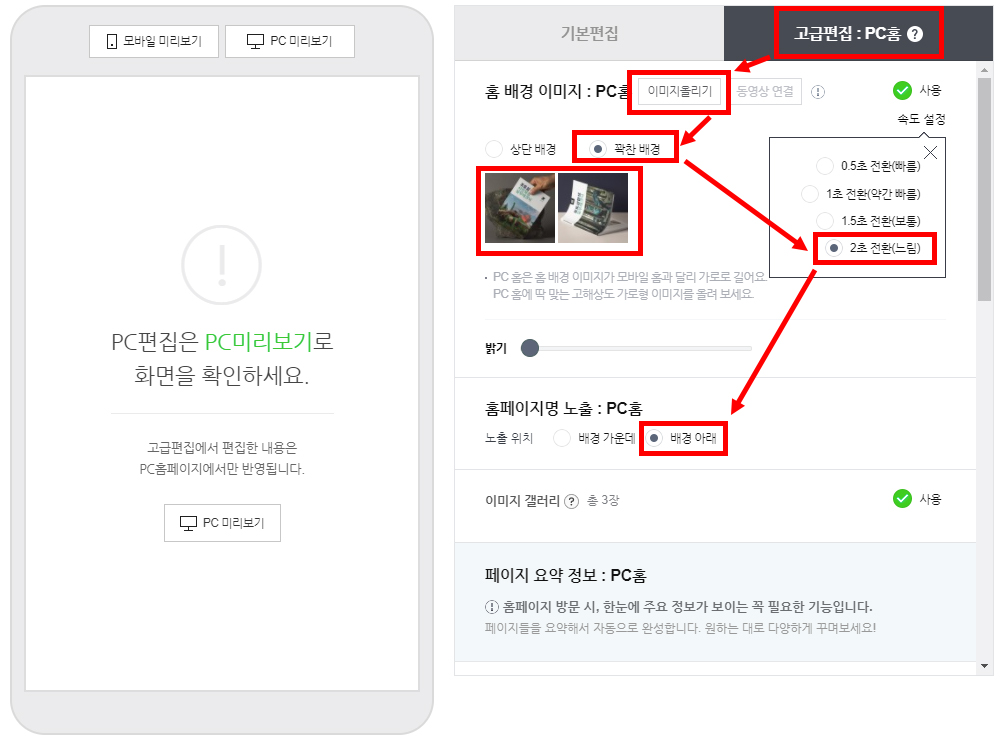 앞선 화면에서 보듯이 기본적으로 PC 메인 이미지는 모바일에서 등록했던 첫번째 이미지가 보이는데요. PC에서는 별도의 다른 이미지로 등록할 수 있습니다. '이미지 올리기'버튼을 클릭한 후 원하는 이미지(가로 1920픽셀이상)를 최대 4장 추가할 수 있습니다. 이미지를 등록한 후 꽉 찬 배경을 선택해서 등록한 이미지가 브라우저 화면에 꽉 차도록 해 줍니다. 등록한 이미지의 전환 속도는 모바일과 마찬가지로 2초로 설정해 줍니다.