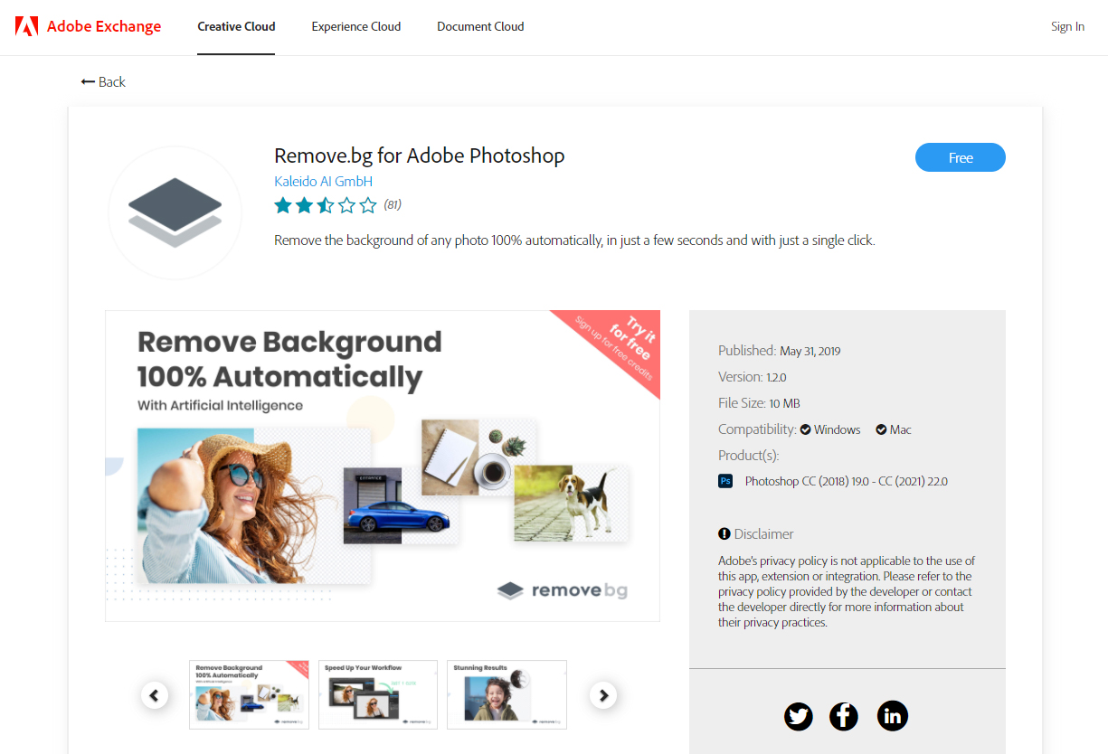 removebg는 포토샵 확장기능도 제공하고 있습니다. 상업용으로 사용하려면 당연히 크레딧을 구매해야 합니다.