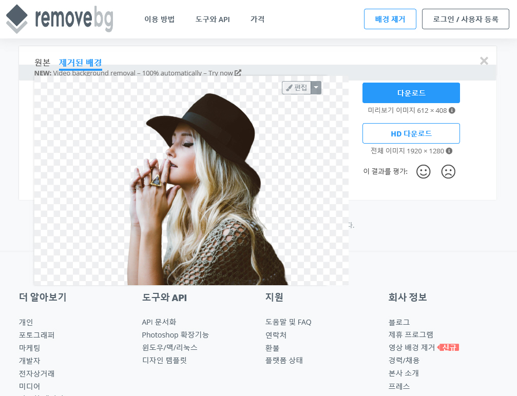 잠시만 기다리면 배경이 제거되어 나타납니다. 원본은 가로 1920사이즈의 큰 이미지인데 결과물은 무료 서비스이기 때문에 가로 612 정도로 작게 리사이즈되었습니다. 아래 그림에서 다운로드를 클릭해서 다운로드하거나 고해상을 원한다면 HD 다운로드를 클릭하여 크레딧으로 결제하면 됩니다.